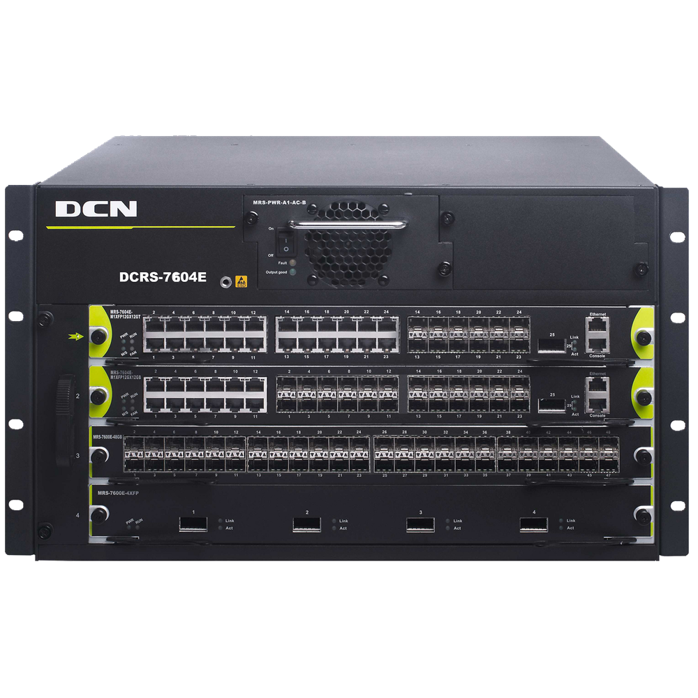 DCRS-7604E DCRS-7604E(R2.0)机箱式路由交换机主机(4个业务插槽,前两个业务插槽可插管理引擎模块,研讨电源1+1冗余),标配1个MRS-PWR-AC-B研讨电源,满配风扇盘,不含管理引擎模块