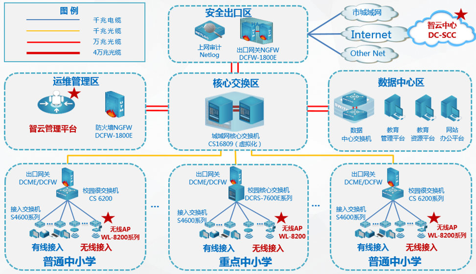 艾弗森贝博ballbet官网 根据普教用户无线网络管理和使用现状,以及对业务应用系统分析,遵从“云网融合 易网无忧”的新主张,对原有有线城域网采用了“云 ‧ 平台”二级智云部署架构,搭建了简单易用的综合智云管理平台,部署了无线网络。既实现了“人 ‧ 网络”的深度管理融合,也为云业务的召开打下良好的基础!总拓扑结构图如下: